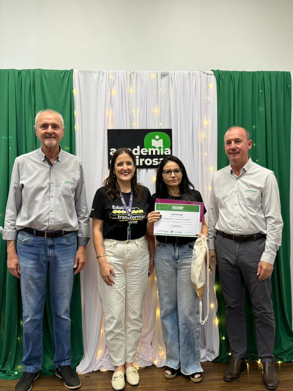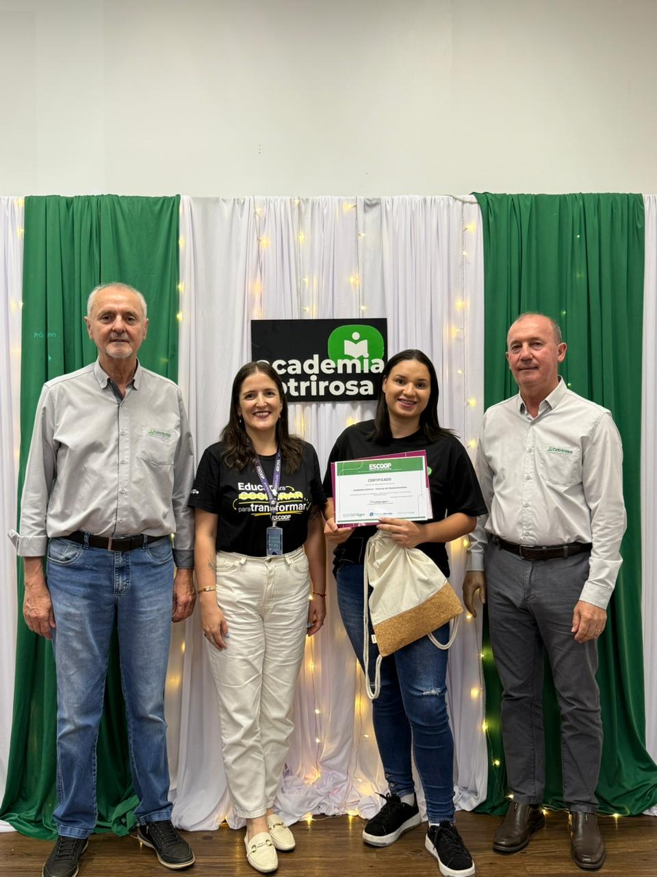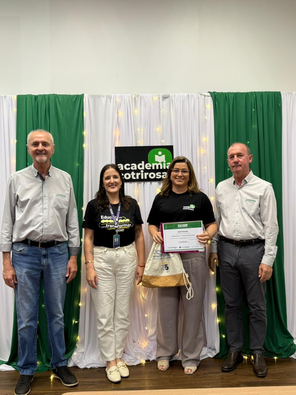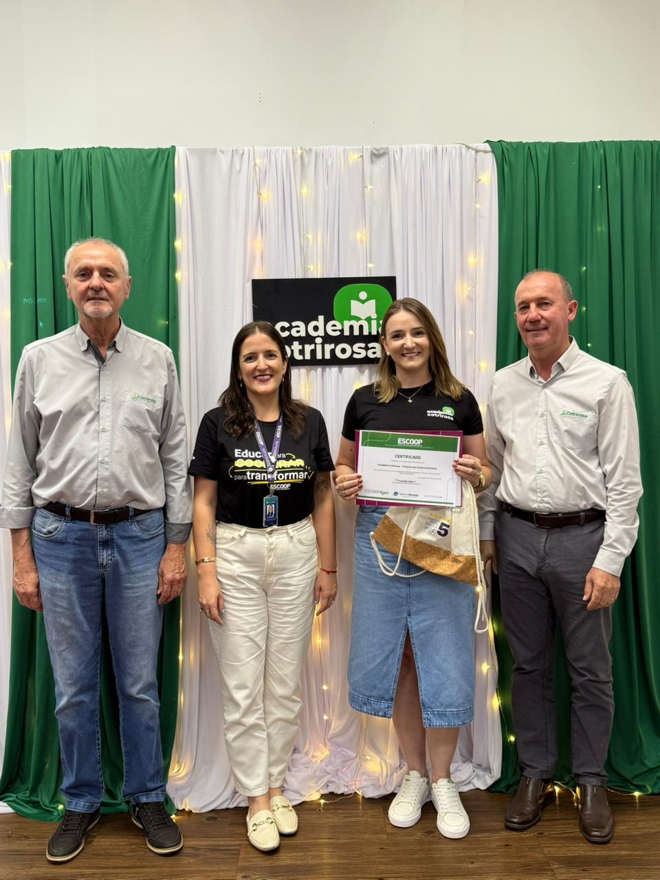 A Cotrirosa realizou, nesta terça-feira, dia 16, a formatura da terceira turma da Academia Cotrirosa – Pessoas em Desenvolvimento, consolidando mais uma etapa importante no investimento em capacitação de pessoas. Ao todo, foram mais de 160 horas de capacitação, com 24 colaboradores formados no projeto.