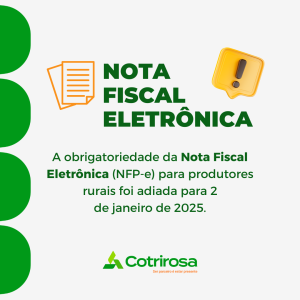 O Conselho Nacional de Política Fazendária (Confaz) adiou a obrigatoriedade da Nota Fiscal Eletrônica, de produtores rurais, para o dia 2 de janeiro de 2025.