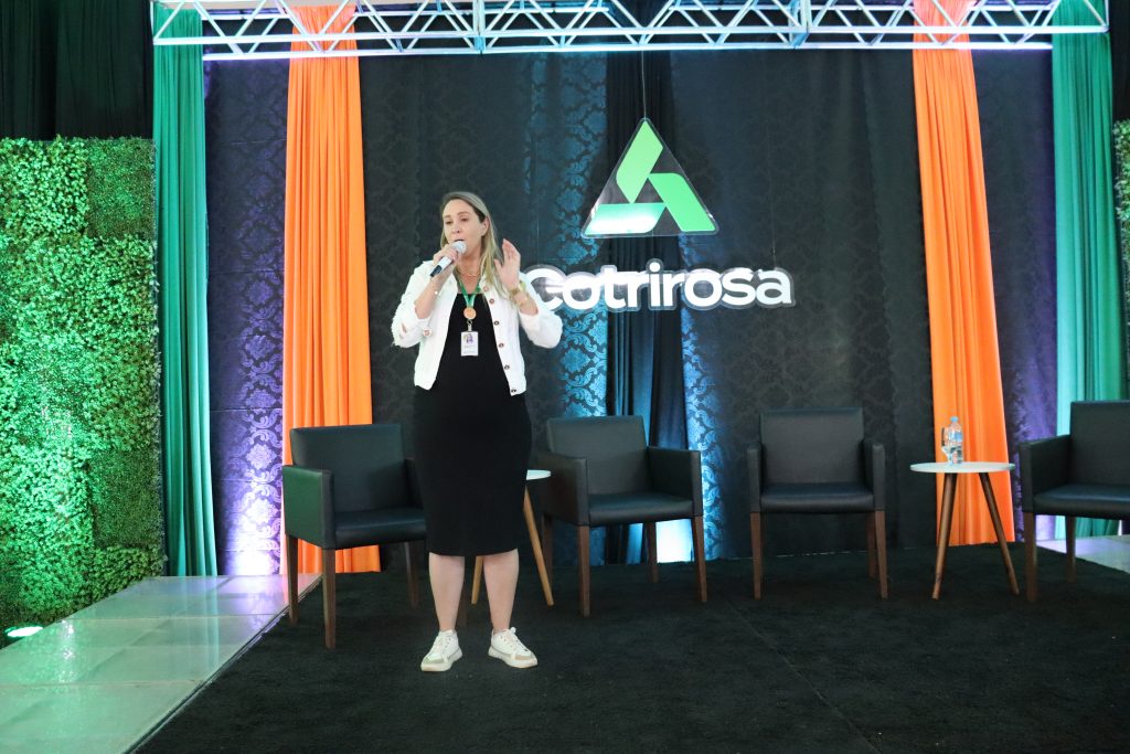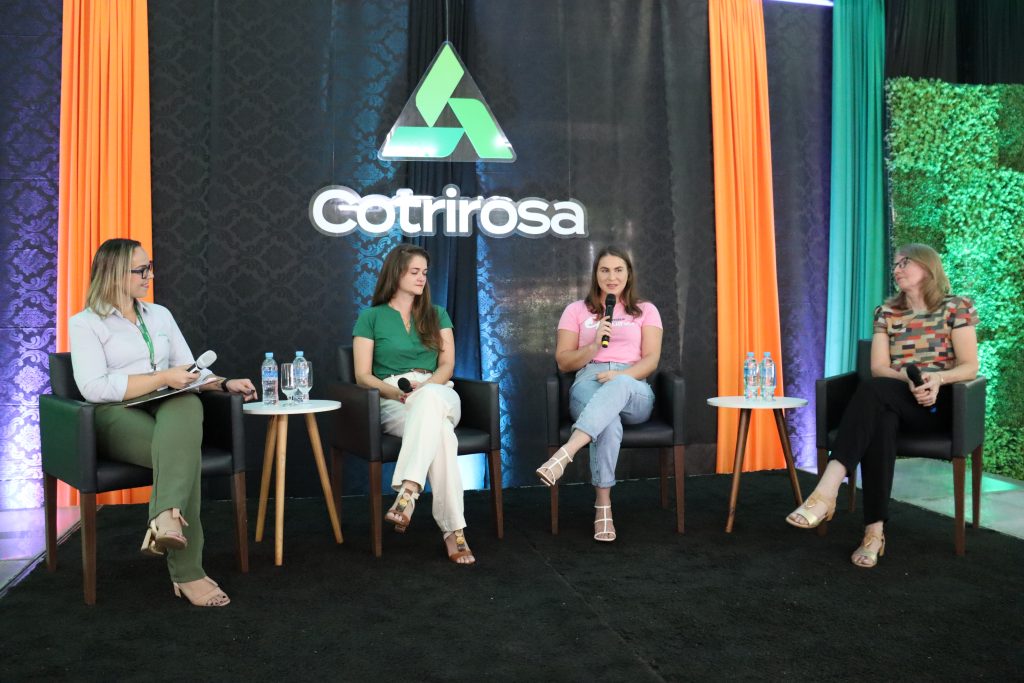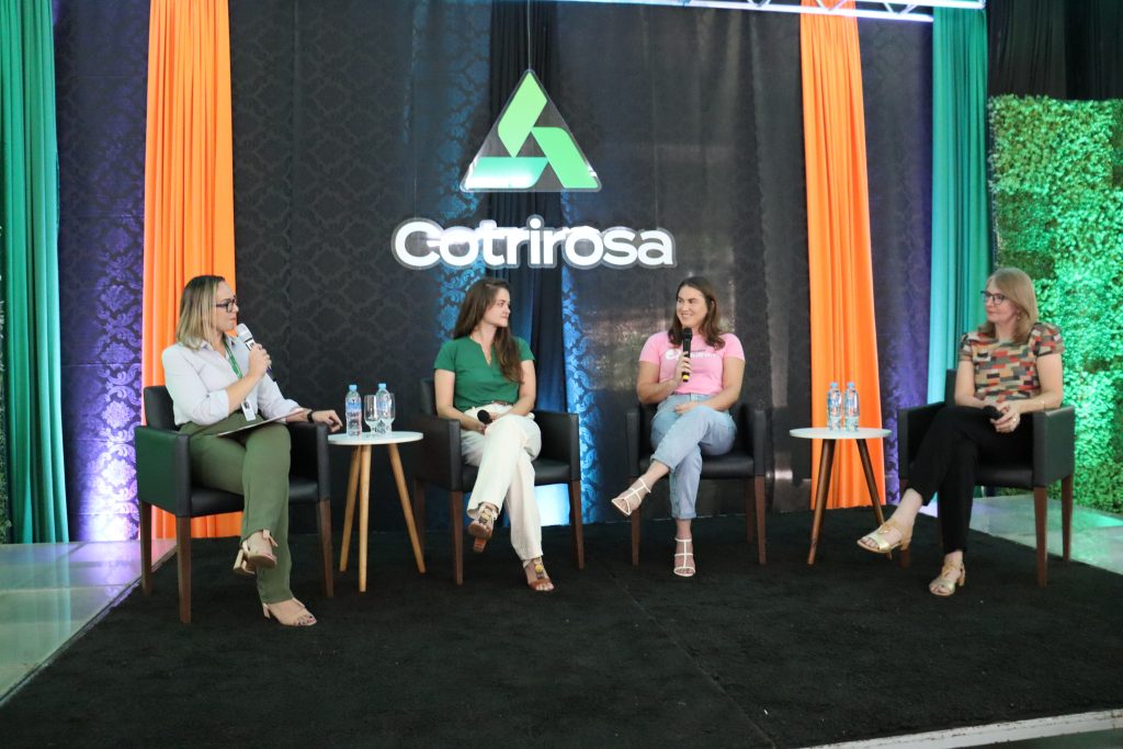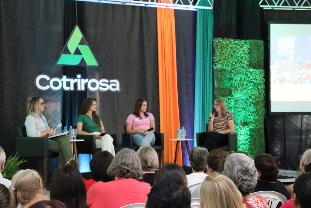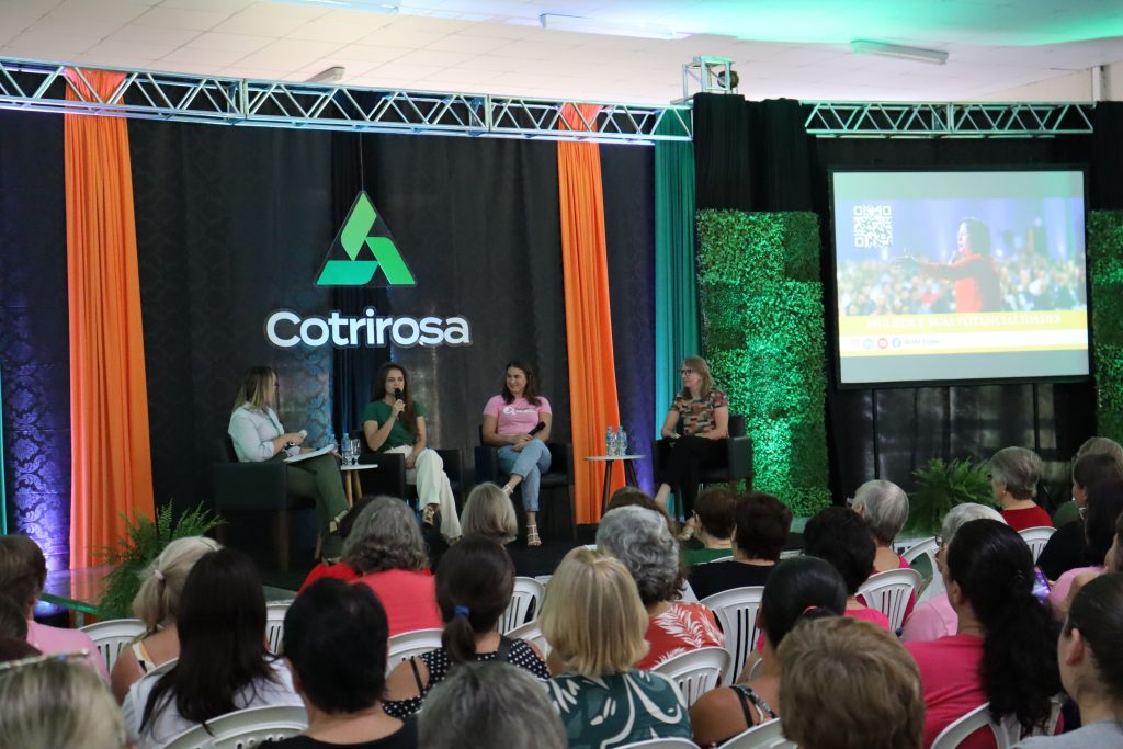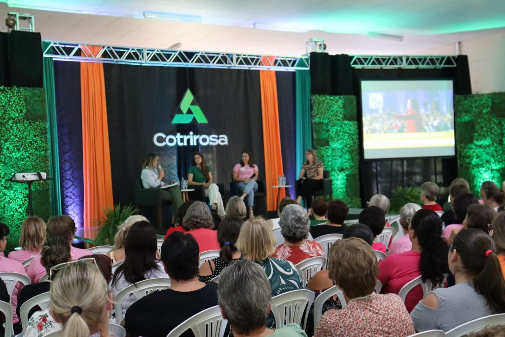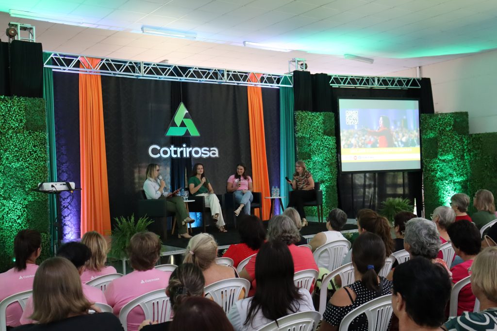 Os princípios do cooperativismo, incluindo adesão voluntária e aberta, gestão democrática, participação econômica dos membros, autonomia e independência, educação, formação e informação, cooperação entre cooperativas e preocupação com a comunidade, são valores que ressoam profundamente com a experiência e os valores das mulheres. Nesse contexto, a Cotrirosa também é um espaço onde as mulheres podem encontrar apoio mútuo, solidariedade e oportunidades de empoderamento econômico e, por isso, foram convidadas as produtoras rurais Raquel Cristina Braun, Danieli Andrea Rambo e Celi Essemburg Jantsch para compartilharem com os presentes suas histórias de superação dos desafios e fortalecimento do trabalho na área do Agro.