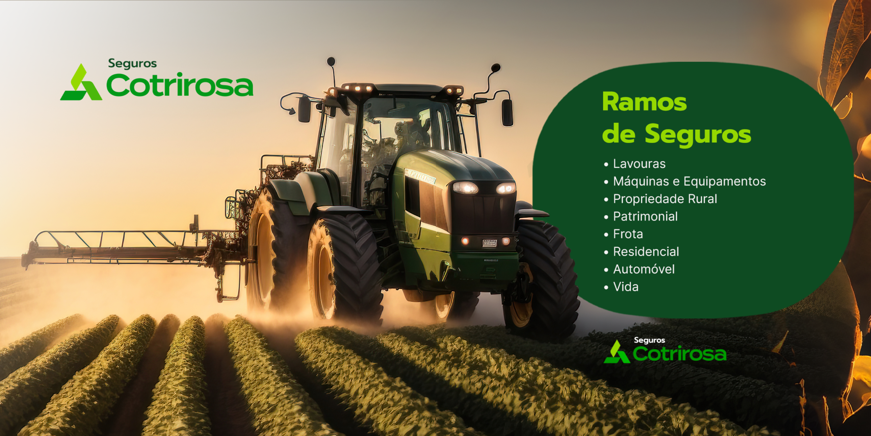 Seguros atendem lavouras, máquinas e equipamentos, propriedade rural, pecuária leiteira, patrimonial, frota, residencial, automóvel e vida.