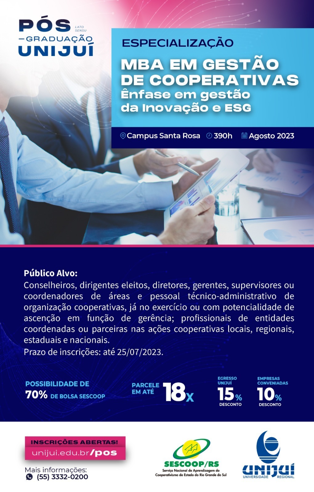Conheça mais sobre o curso no link abaixo: https://www.unijui.edu.br/estude/educacao-continuada/mba-e-especializacao/mba-em-gesto-de-cooperativas-30