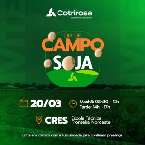 Na quarta-feira, 20 de março, a Cotrirosa vai realizar o Dia de Campo da cultura da soja. O evento vai ocorrer na Área Experimental da Cooperativa, que fica localizada no CRES - Escola Estadual Técnica Fronteira Noroeste. Associados de todas as Unidades estão convidados e para agilizar o deslocamento, a Cotrirosa vai disponibilizar transporte gratuito.