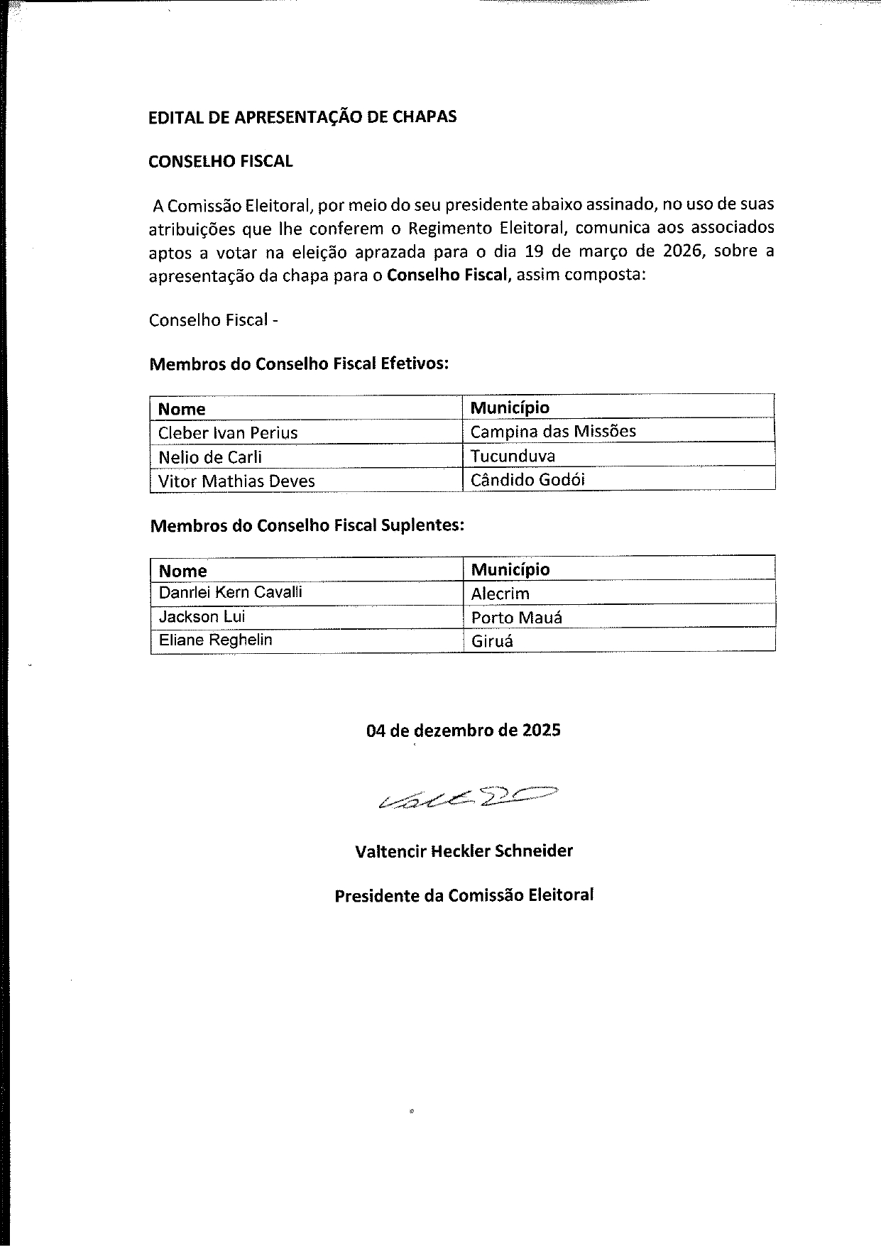 A Comissão Eleitoral, por meio do seu presidente abaixo assinado, no uso de suas atribuições que lhe conferem o Regimento Eleitoral, comunica aos associados aptos a votar na eleição aprazada para o dia 19 de março de 2026, sobre a apresentação da chapa para o Conselho Fiscal, assim composta: