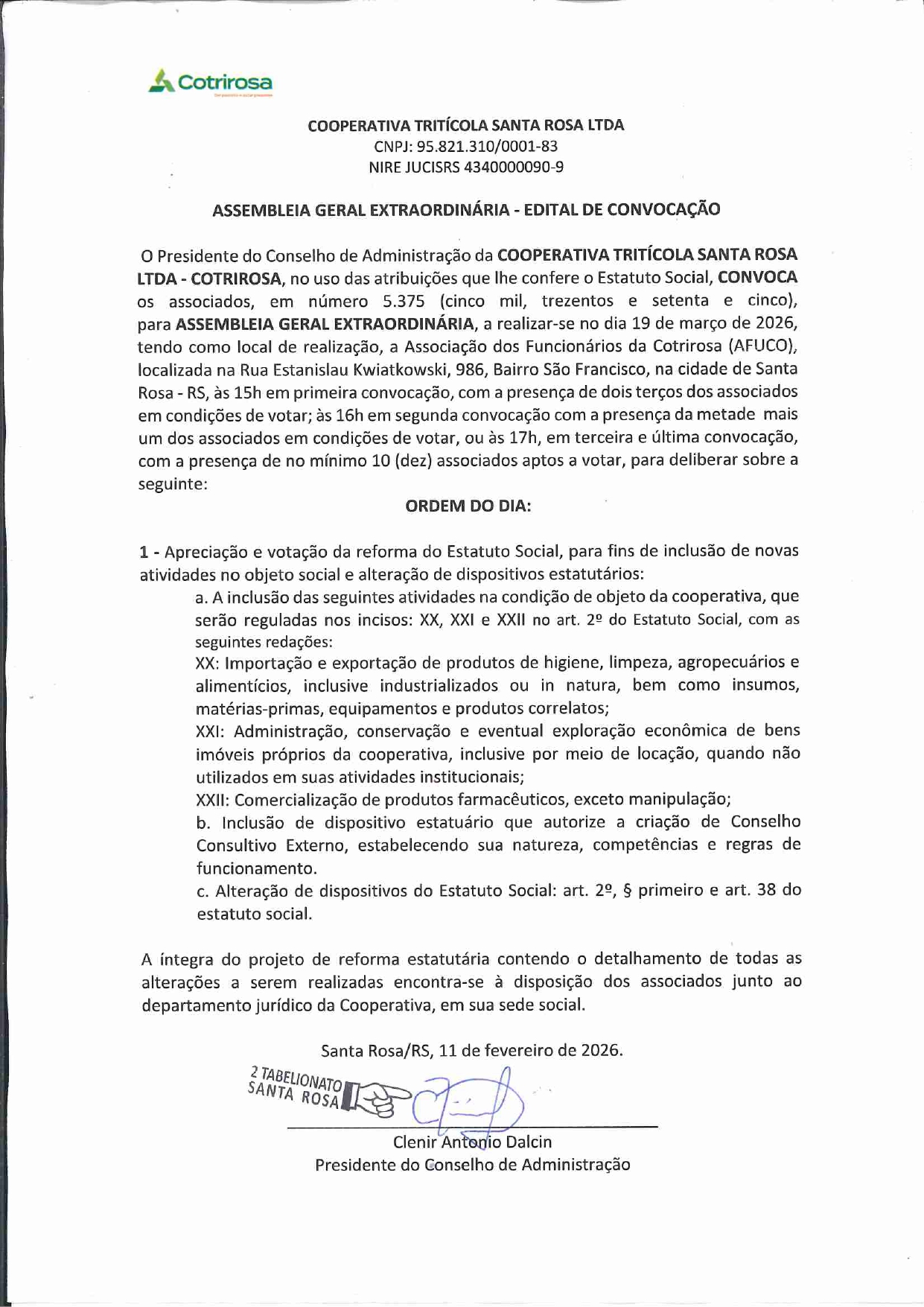 O Presidente do Conselho de Administração da COOPERATIVA TRITÍCOLA SANTA ROSA LTDA - COTRIROSA, no uso das atribuições que lhe confere o Estatuto Social, CONVOCA os associados, em número 5.375 (cinco mil, trezentos e setenta e cinco), para ASSEMBLEIA GERAL EXTRAORDINÁRIA, a realizar-se: