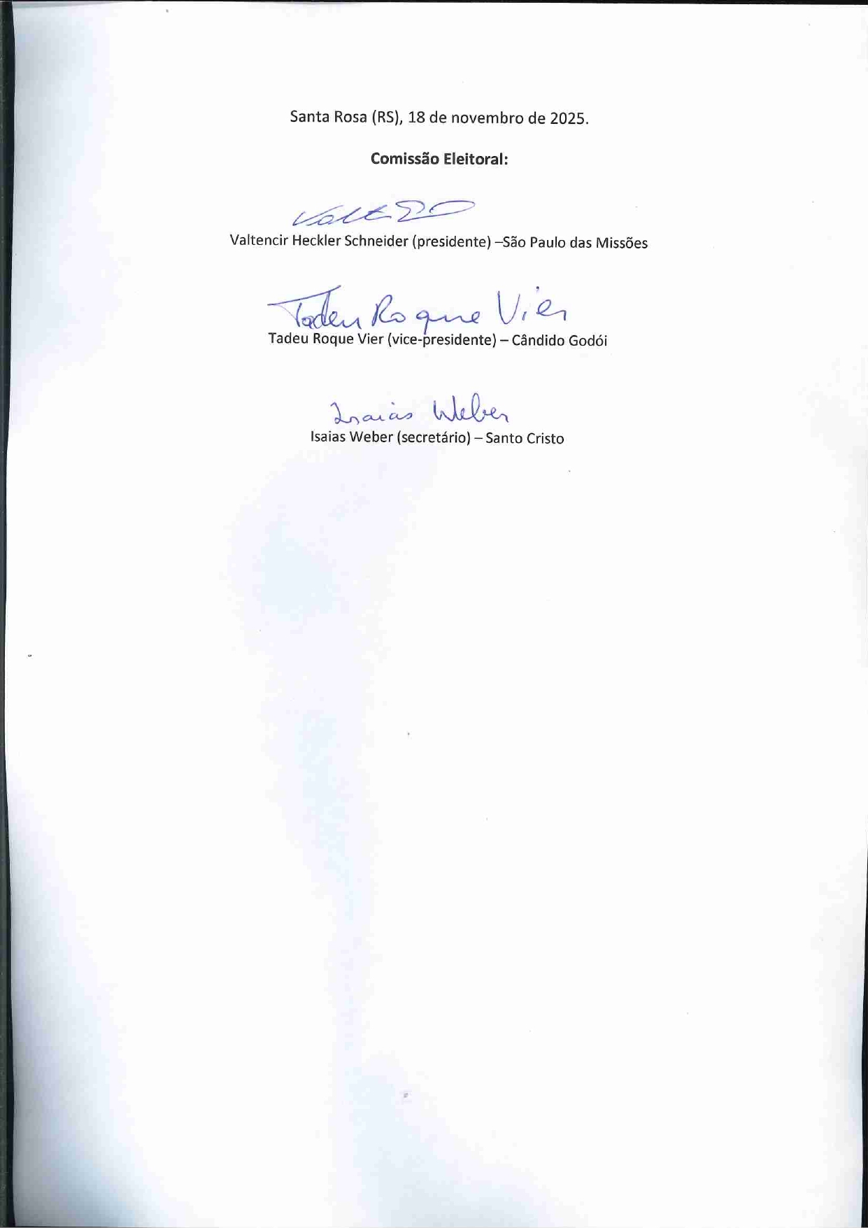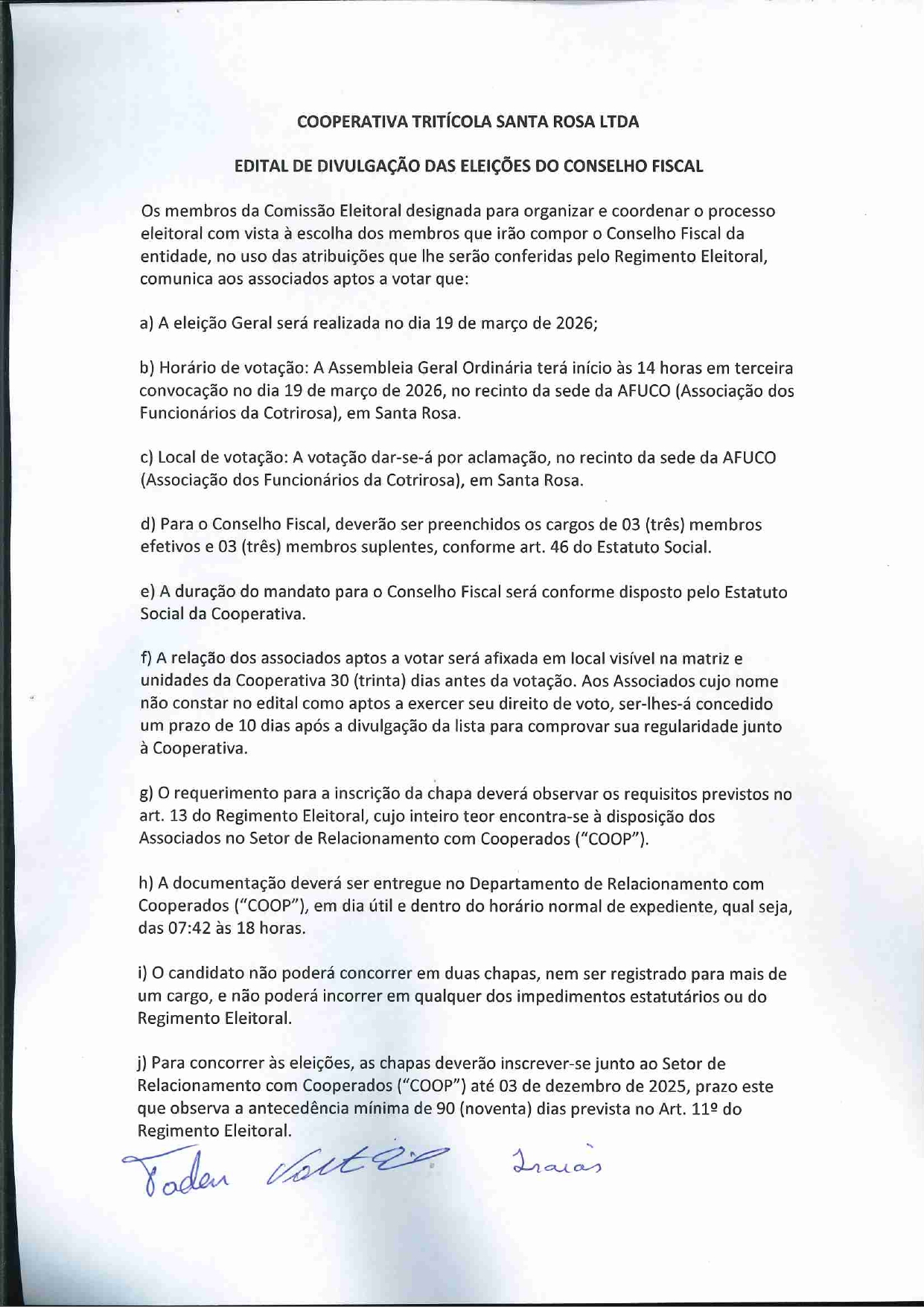 A Comissão Eleitoral da Cotrirosa, formada pelos associados: Valtencir Heckler Schneider (presidente) – São Paulo das Missões, Tadeu Roque Vier (vice-presidente) – Cândido Godói, e Isaias Weber (secretário) – Santo Cristo, informa que a inscrição das chapas para a eleição do Conselho Fiscal 2026 encerra no dia 03 de dezembro. Comunicado referente aos procedimentos para inscrições de chapas: