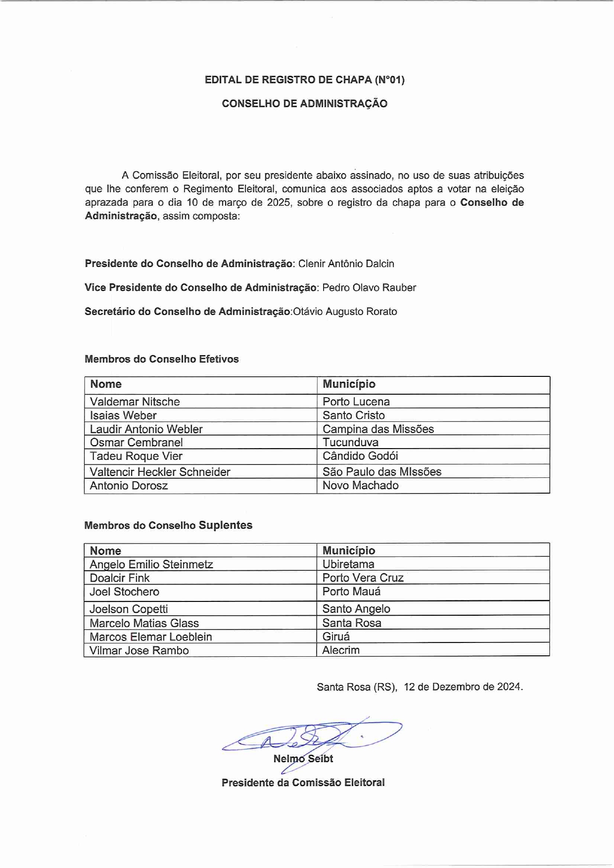 A Comissão Eleitoral, por seu presidente abaixo assinado, no uso de suas atribuições, que lhe conferem o Regimento Eleitoral, comunica aos associados aptos a votar na eleição aprazada para o dia 10 de março de 2025, sobre o Registro da chapa para o Conselho de Administração, assim composta: