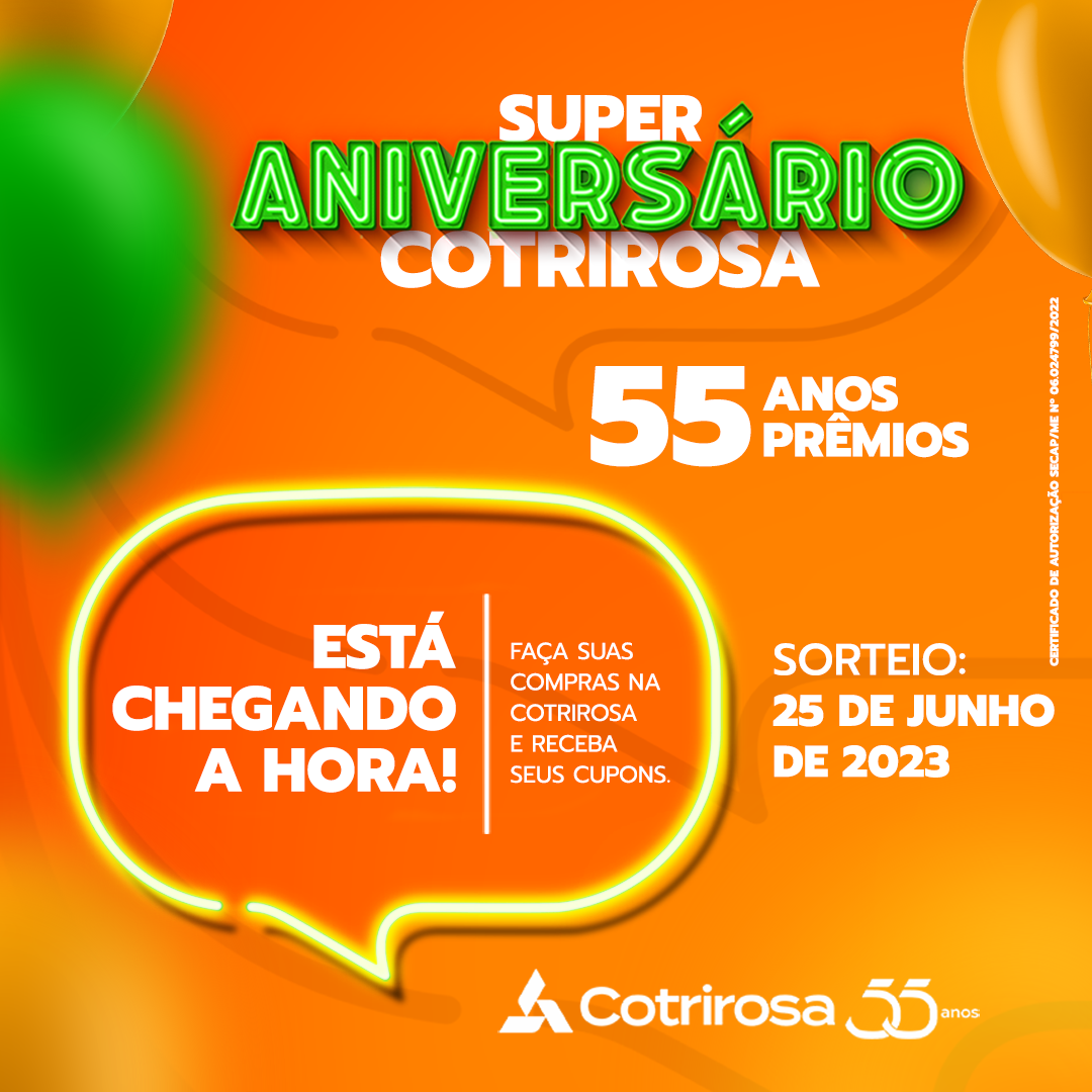 Faltando praticamente um mês para o final da campanha da Cotrirosa, em comemora aos 55 anos da Cooperativa, a promoção tem continuidade até o próximo dia 25 de junho. A campanha Cotrirosa 55 anos – 55 prêmios, lançada em novembro de 2022, se estende até o próximo mês, quando ocorre o sorteio dos prêmios e a festa da Cotrirosa.