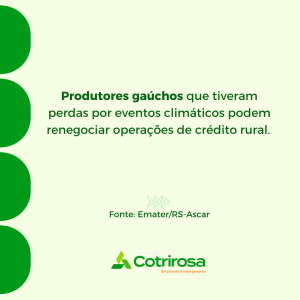 Tendo em vista o grande volume de perdas nas atividades agropecuárias que as chuvas e enchentes das últimas semanas provocaram, e que ainda estão sendo quantificadas pelos técnicos da Emater/RS-Ascar em todo o Rio Grande do Sul, a Instituição chama a atenção dos produtores que possuem financiamentos para algumas medidas que podem ser adotadas a fim de aliviar o peso das obrigações financeiras neste momento de calamidade pública que o Estado atravessa.