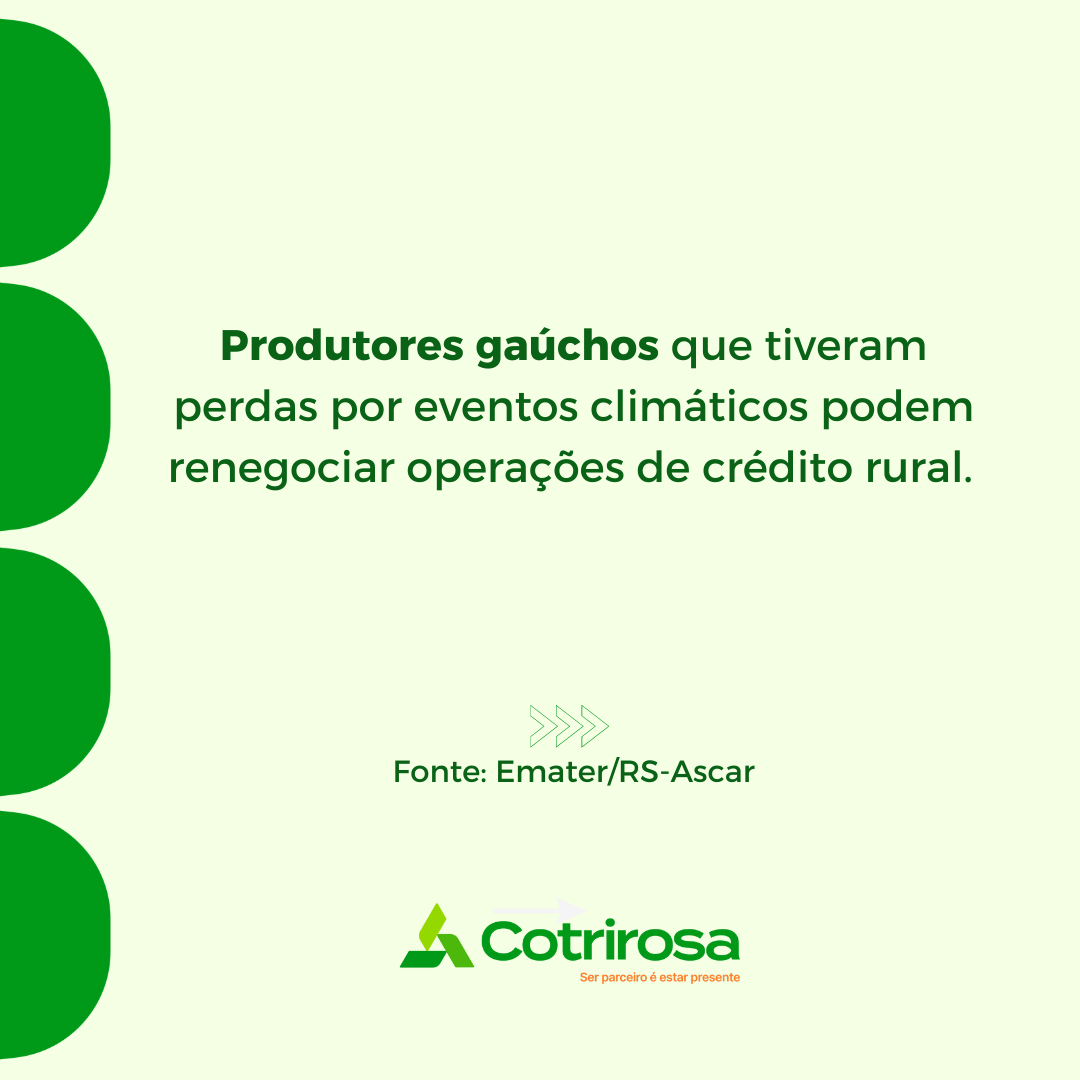 O coordenador da Área de Crédito Rural e assessor especial da Diretoria Técnica da Emater/RS-Ascar, engenheiro agrônomo Célio Colle, destaca que no dia 28 de março de 2024, através da resolução 5.123, o Conselho Monetário Nacional (CMN) autorizou a renegociação de parcelas de operações de crédito rural de investimento contratadas por agricultores familiares, médios e demais produtores rurais cuja renda da atividade tenha sido prejudicada por adversidades climáticas ou dificuldades de comercialização. "O objetivo da medida é permitir a renegociação de dívidas daqueles agricultores que tinham investimentos atrelados à cultura da soja, milho e leite com parcelas vencidas ou por vencer entre 2 de fevereiro e 30 de dezembro deste ano e tiveram prejuízos decorrentes das questões climáticas ou foram afetados pela queda de preço. Estes produtores podem procurar seu banco ou cooperativa e pedir a prorrogação destes débitos", explica Colle.