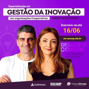 Assim, em virtude das circunstâncias atuais, a Escoop estendeu o período de inscrições da Especialização em Gestão da Inovação em Organizações Cooperativas - Turma Santa Rosa, até 16 de junho de 2024.